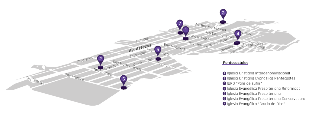 La iglesia Cristiana Evangélica Pentecostés Nacional tiene una construcción modesta sin ninguna inscripción afuera más que un pequeño letrero donde se anuncia con dos palomas que sostienen un cartel que dice “La Hermosa”. Una placa de metal al lado de la puerta reza “Propiedad federal” (y el registro correspondiente). Por dentro hay un salón oscuro y sencillo; la única inscripción al fondo es una manta con la frase “Dios es amor” y una bandera mexicana en la esquina. En el lugar se ofrecen servicios religiosos diarios. Su pastor es asistido por varios ministros que le ayudan en tareas puntuales de evangelización. En vacaciones ofrecen un curso gratuito con trabajos manuales, juegos, historias bíblicas.