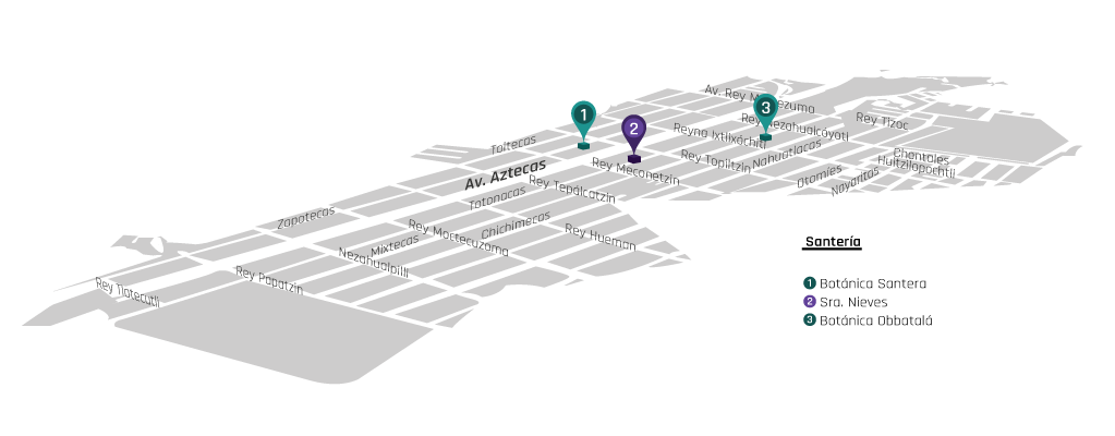 La santería se instaló en la colonia el Ajusco en pequeños establecimientos abiertos al público, uno ubicado en la avenida con mayor flujo comercial y vehicular de la zona Av. Aztecas; mientras que otro local estuvo cerca del mercado de La Bola. Los dos locales actualmente ya no existen. Para 2009 estos dos lugares santeros, llamados botánicos, tenían una presencia significativa dentro de la colonia por su forma pública. El dinamismo y la estigmatización que presenta en sí la religión santera hace difícil poder cuantificar el culto afrocubano dentro de la colonia. Si bien es una práctica religiosa también es considerada una forma no institucional, por lo tanto, desacreditada por parte de las grandes instituciones religiosas, en este caso la Iglesia Católica. Es por esta razón que la dificultad para rastrear el culto se vuelve aún más complicada.